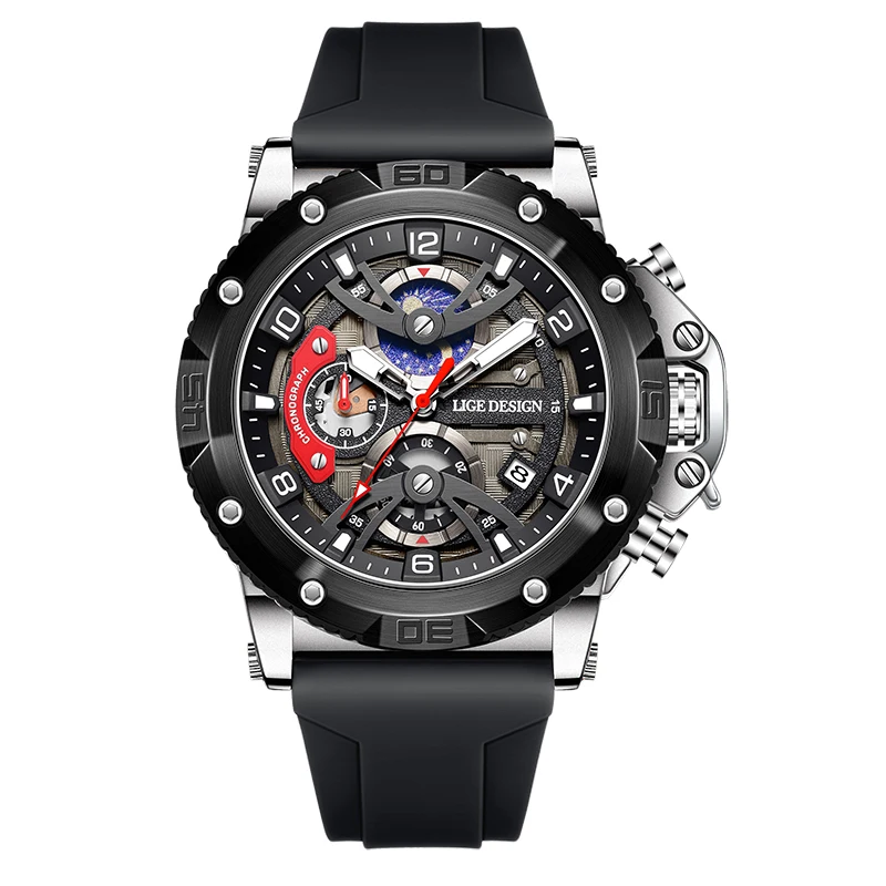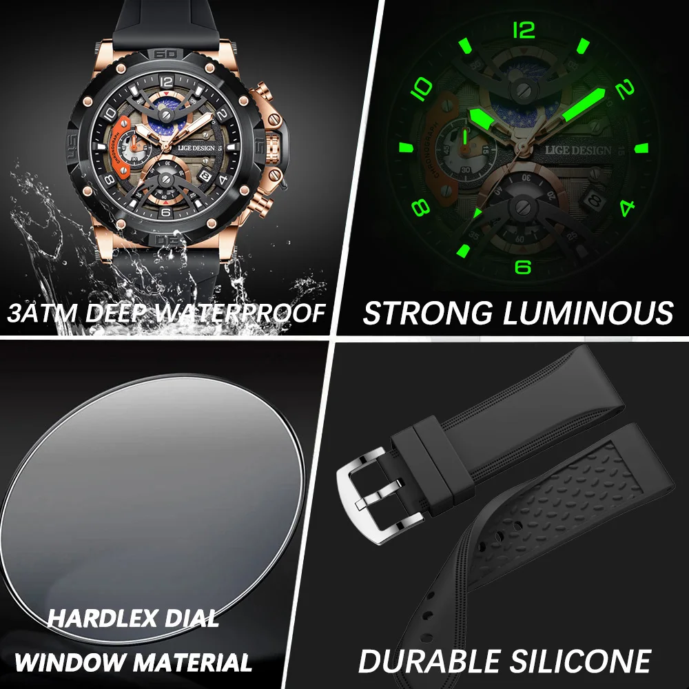 LIGE Sports Man Watch Top Brand Luxury Silicone Chronograph Small Dial Function Quartz Wristwatches Waterproof Luminous Watch