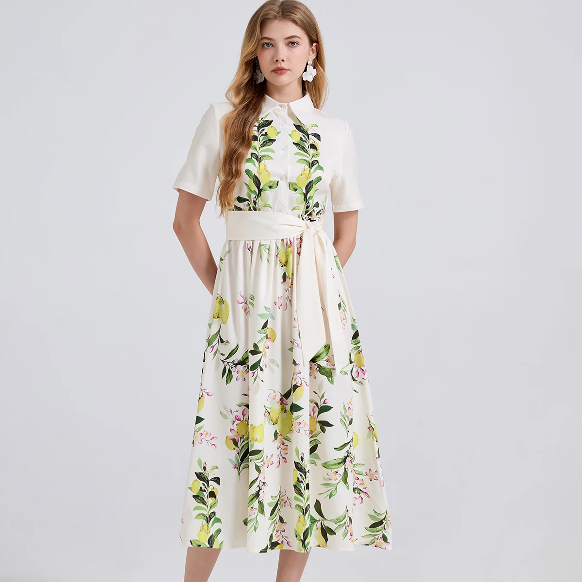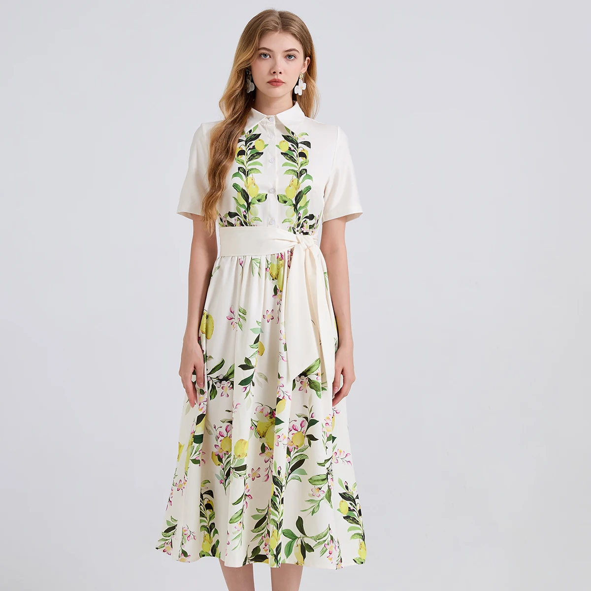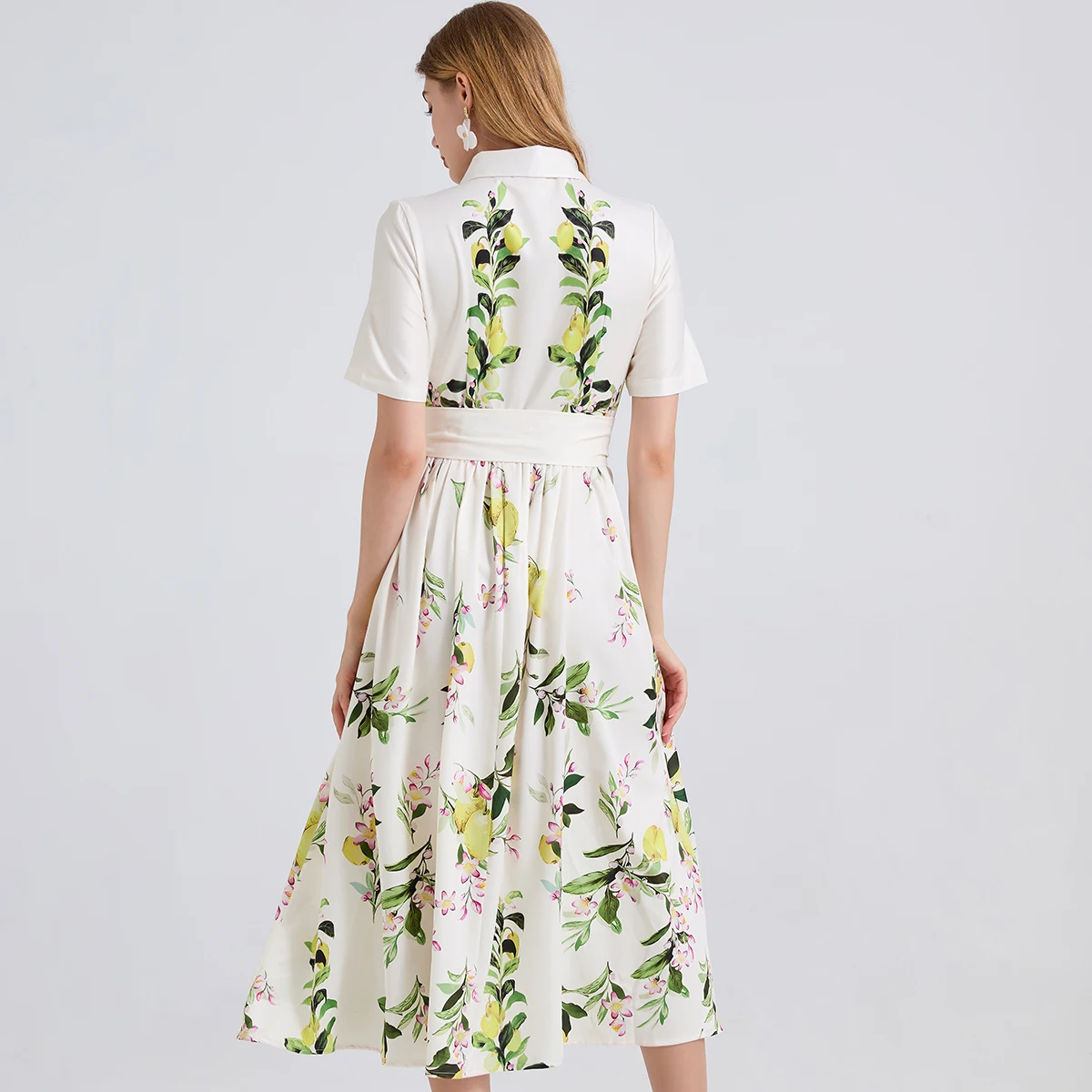 Brand Designer Floral Long Dress Shirt Women Summer Holiday Single Breasted Pears Tree Printed Midi Casual Dresses Female