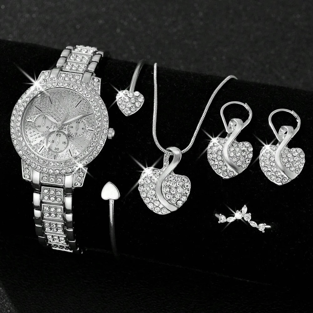 Women's Quartz Watch Gold Luxury Women Ring Necklace Earring Rhinestone Fashion Wristwatch Casual Ladies Watches Jewelry Set
