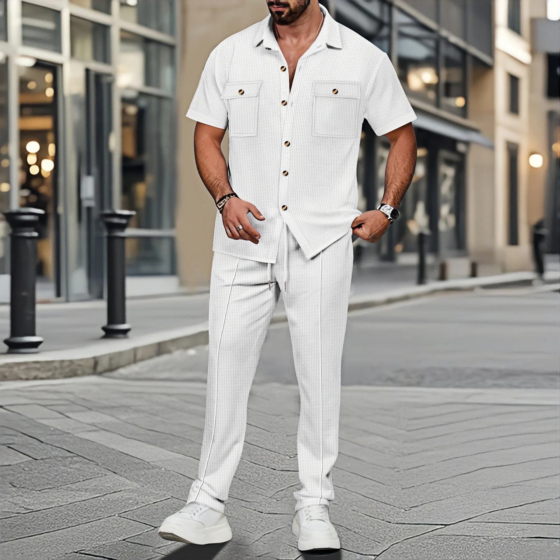 Men's Casual Suit Short-Sleeved Waffle Check Shirt with Pocket Comfortable Solid Color Spring Summer Fashion Two-Piece Set