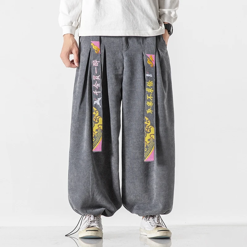 Vintage Crane Harem Pants Flutter Embroidered Corduroy Harlan Trousers Man Baggy Wide Leg Lantern Pants Straight Leg