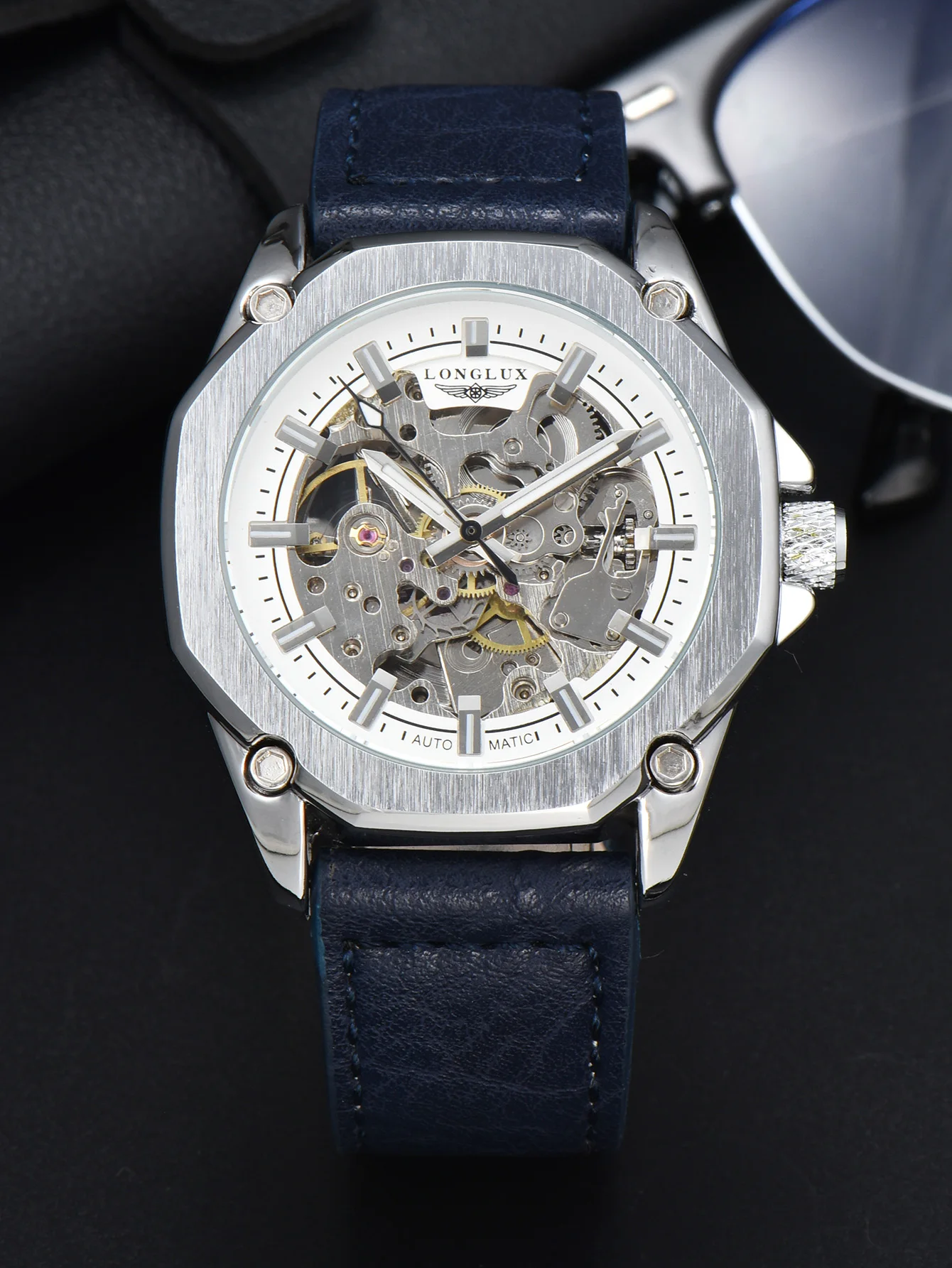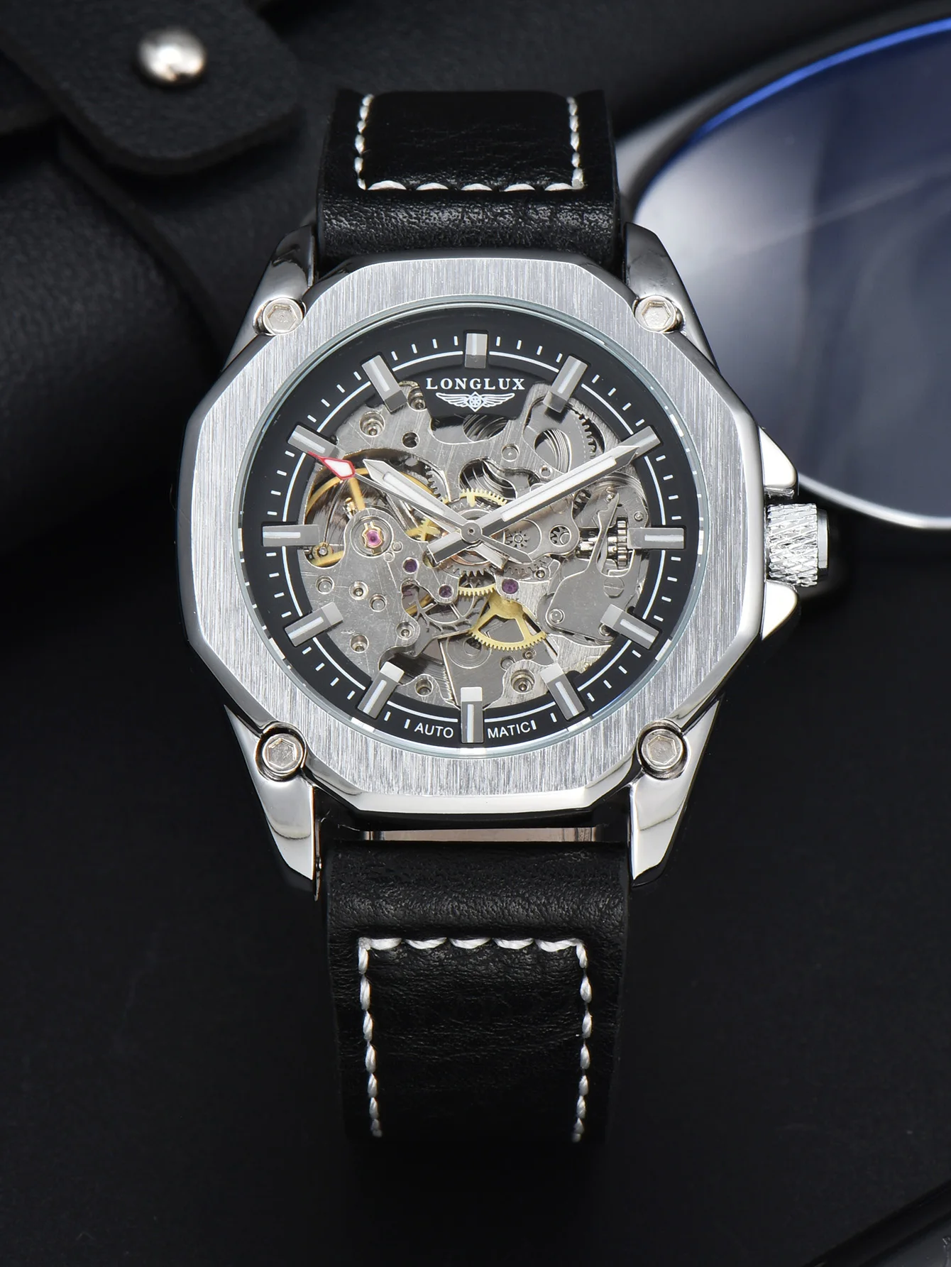 LONGLUX automatic watch sport style wholesale mechanical wristwatches fashion hollow leather mens watch men gift