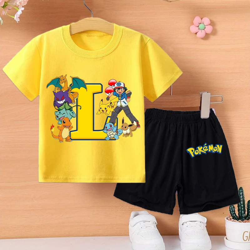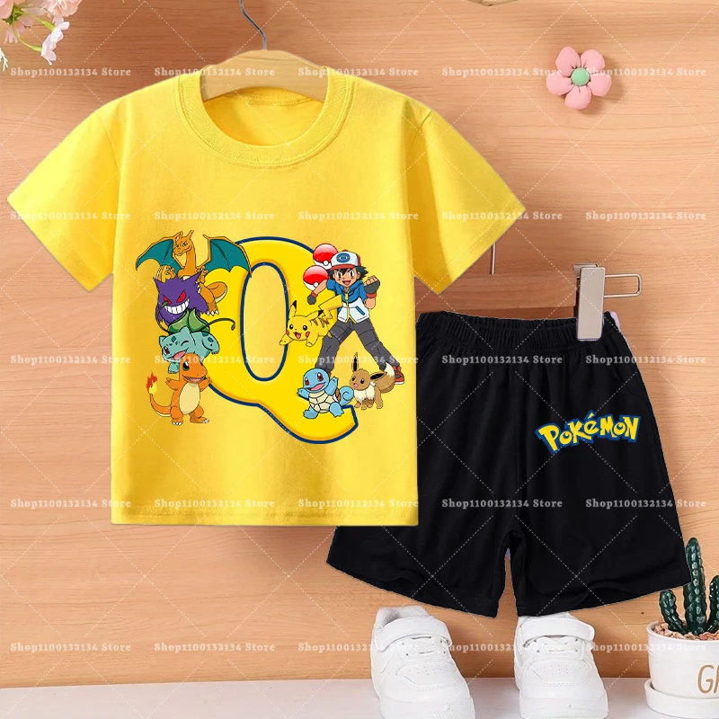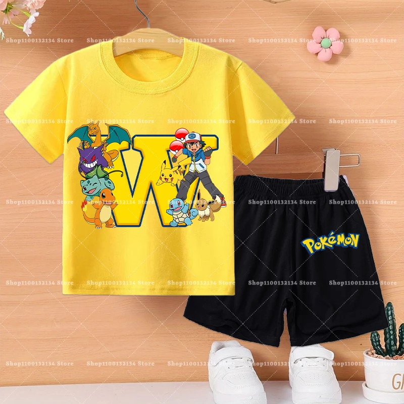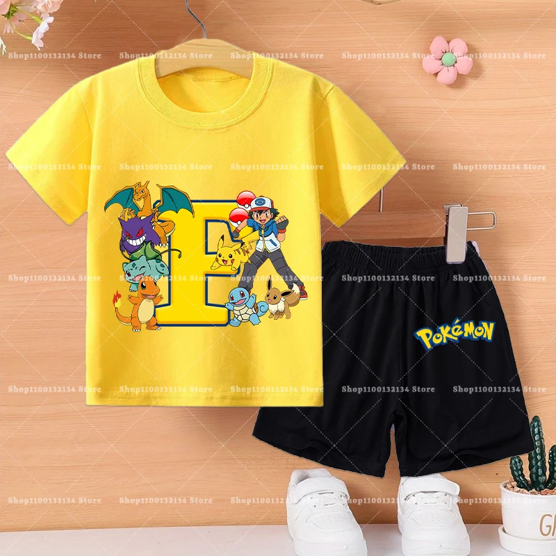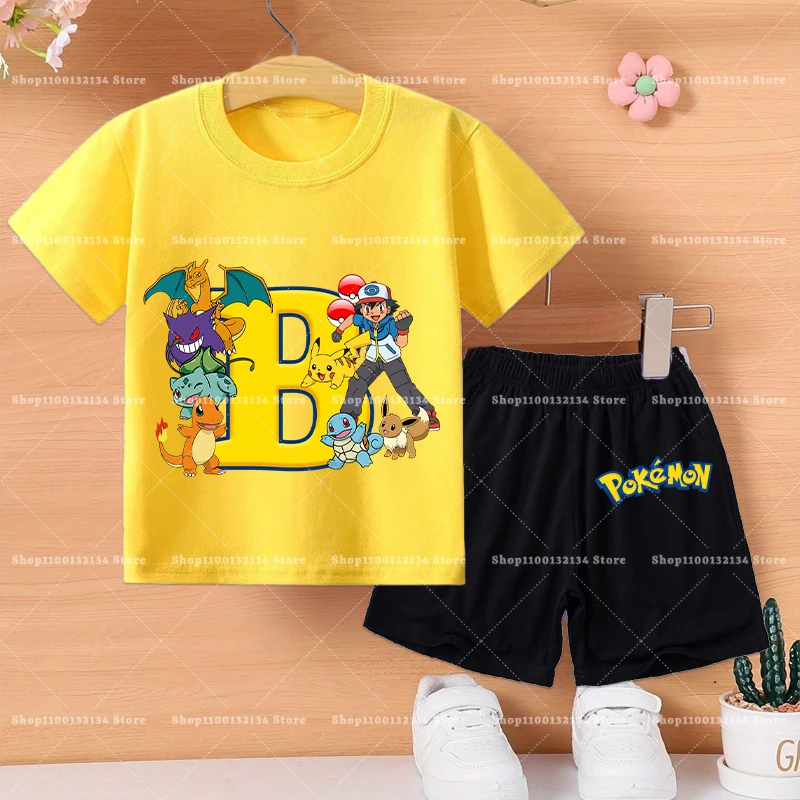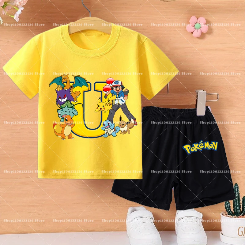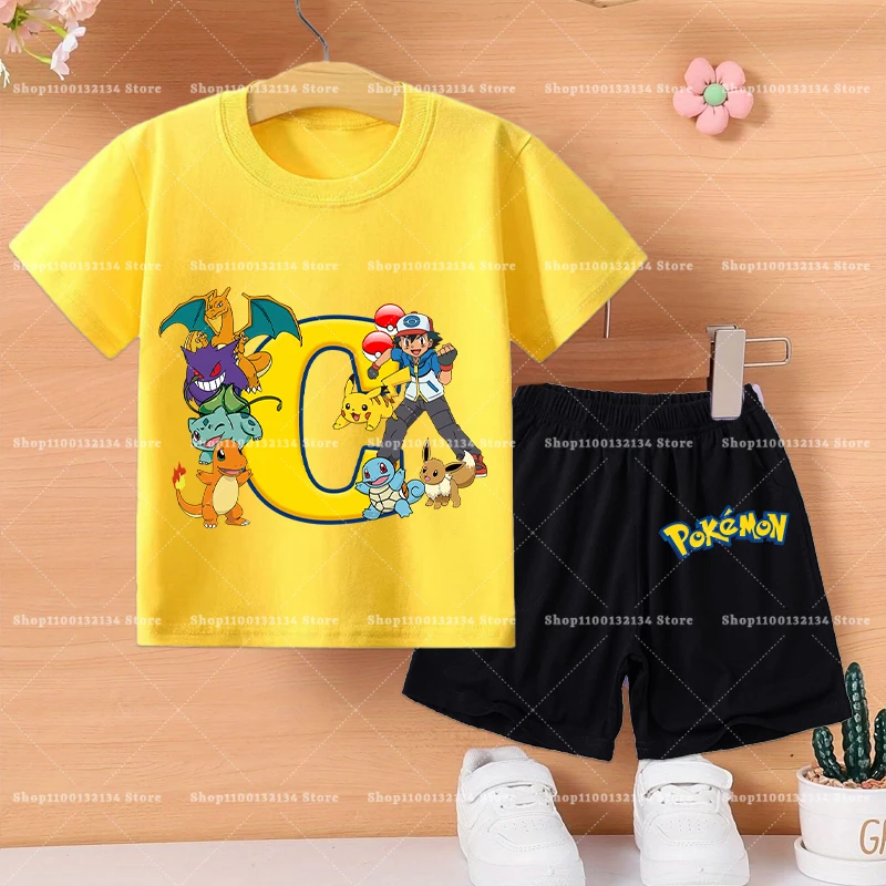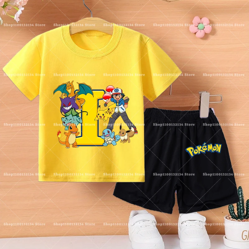 Pokemon Pikachu Kids T-Shirt Shorts Suit Cartoon Letter Boys Girls Summer Clothes Outfit Tracksuit Printed Tees Pajamas Sets New