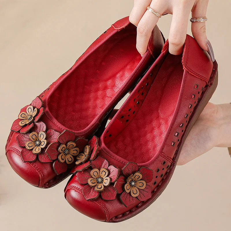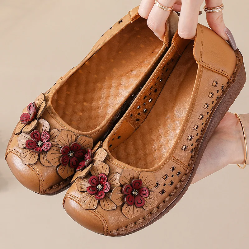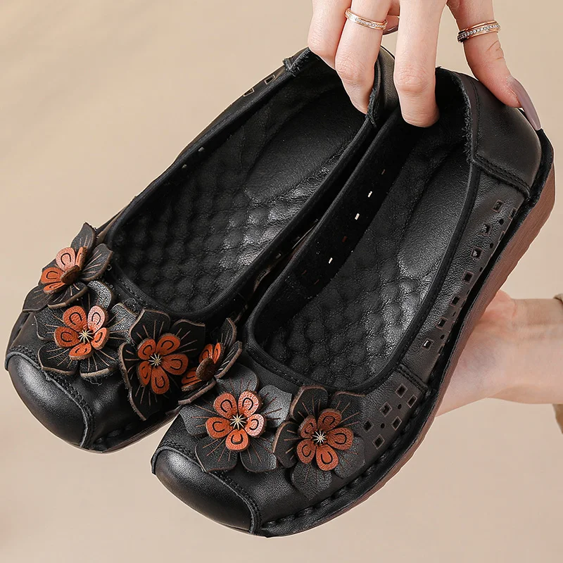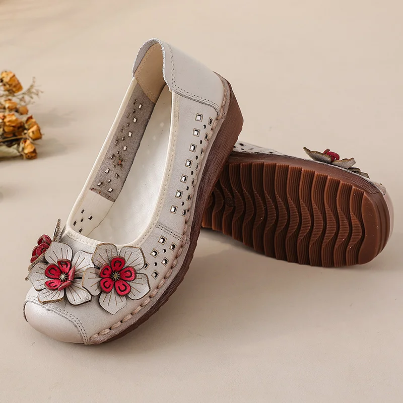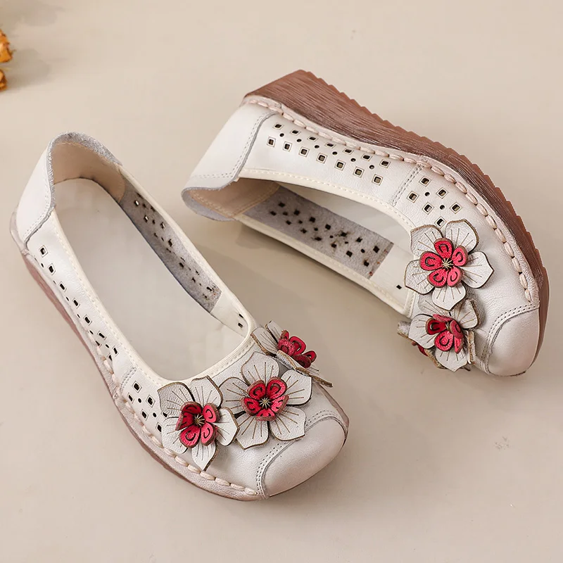 New Exquisite Cow Leather Wedged Flats Women Handmade Cutout Flower Moccasins Woman Antique Slip On Shoes Ladies Elegant Flats